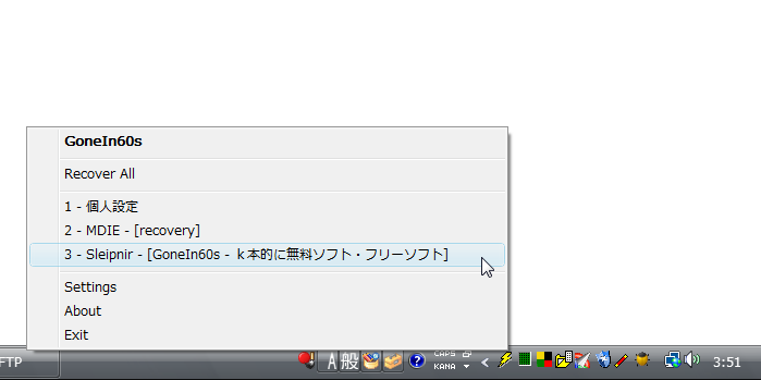 終了保留状態にあるウインドウは、「GoneIn60s」に格納されているだけなので、いつでもタスクトレイ上のアイコンから復旧させることができます。
