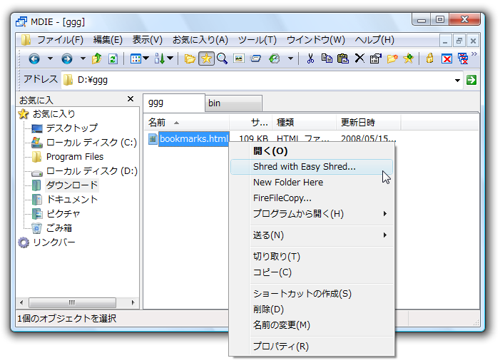 操作は、ファイルやフォルダの右クリックメニューから、または、「Easy Shred」の