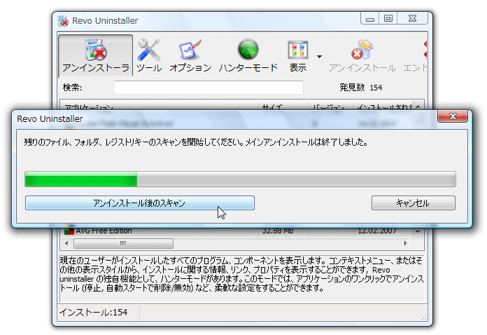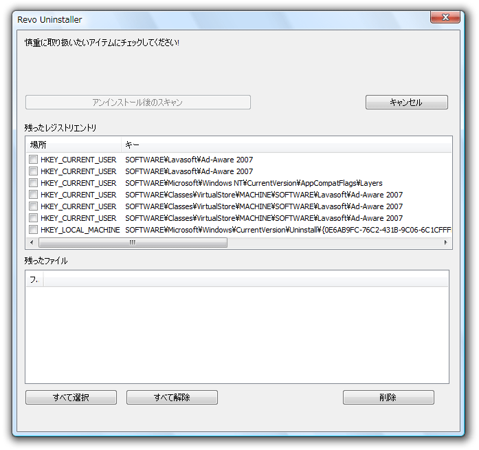ここで「アンインストール後のスキャン」をクリックすると、続けて
