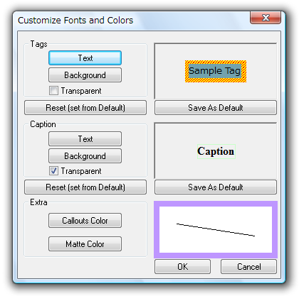 今回設定した内容がデフォルトの設定として記憶されます。 - 次に、「Tag」「Caption」欄の「Background(背景)」ボタン、「Extra」欄の